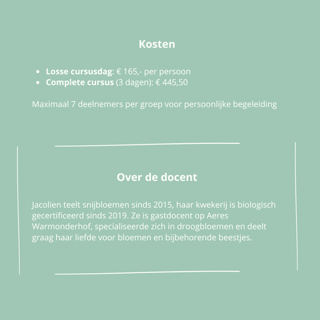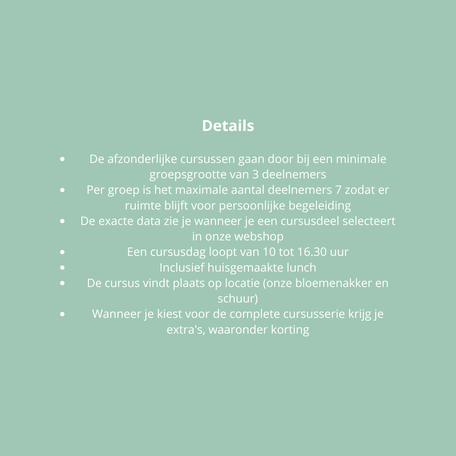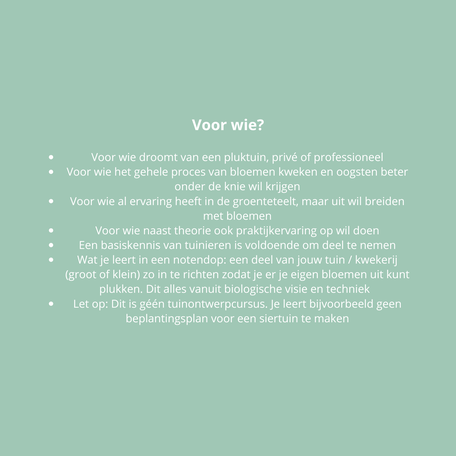 Na afloop van deze cursus heb je stevige handvatten waarmee je structuur aan kunt brengen in jouw toekomstige bloemenbedrijf of bloementuin. De kennis die je deze dag op doet helpt je de juiste keuzes te maken om zo jouw droom werkelijkheid te maken.