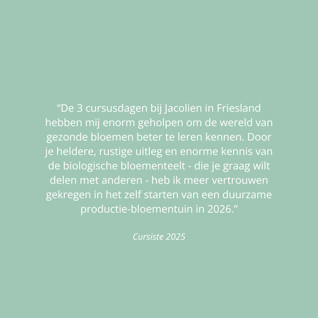Wil je echt serieus aan de slag met het biologisch telen van bloemen? Dan is de complete cursusserie iets voor jou. In deze serie komen alle onderdelen van Deel 1 t/m 3 (zoals onder aan deze pagina omschreven) aan bod. Wanneer je kiest voor de volledige serie krijg je 10% korting op het volledige aankoopbedrag. De prijzen voor de cursus vind je in onze Webshop.